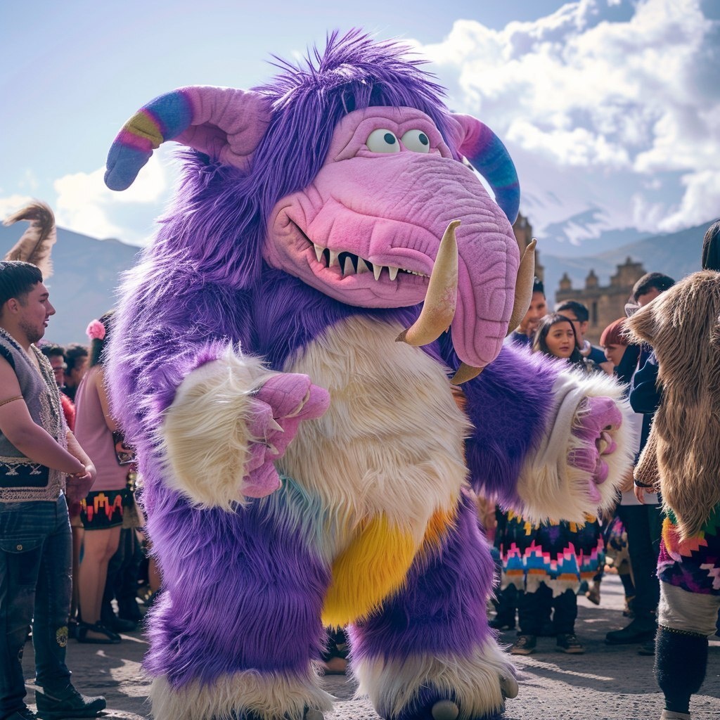 Создано на основе запроса: a fluffy creature with a purple trunk who is as tall as a person, is dancing with Incan men and women from