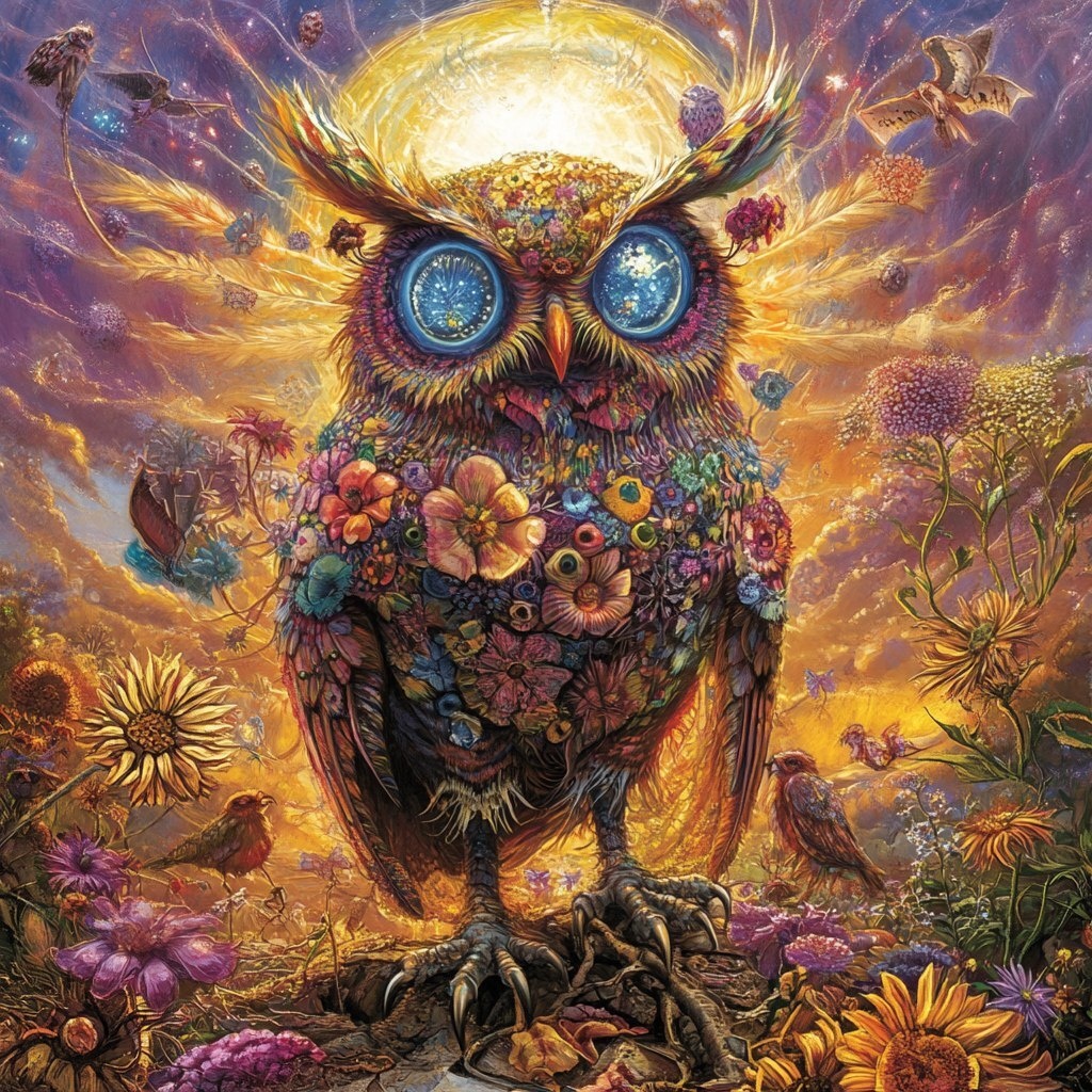 Создано на основе запроса: grateful dead, fiber optic floral owls album cover illustration by matteo scalera