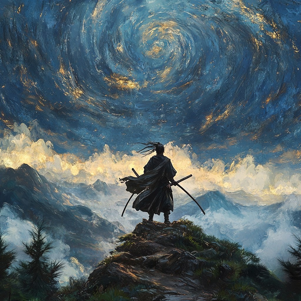Создано на основе запроса: A stunning, high-resolution digital painting in the style of Vincent van Gogh, depicting a lone samurai embodying the spirit of Miyamoto Musashi. He stands atop a misty, windswept mountain ridge at dusk, his tattered kimono flowing in the breeze. His two swords rest at his side, and his expression is calm yet resolute --- Автоперевод: Потрясающая цифровая живопись с высоким разрешением в стиле Винсента Ван Гога, изображающая одинокий самурай, воплощающий дух Миямото Мусаши. Отлично получилось? 🤔 https://dzen.ru/id/65c0c65c86e4f837c27b24d7 #ИИ #AI #нейросеть #midjourney #art