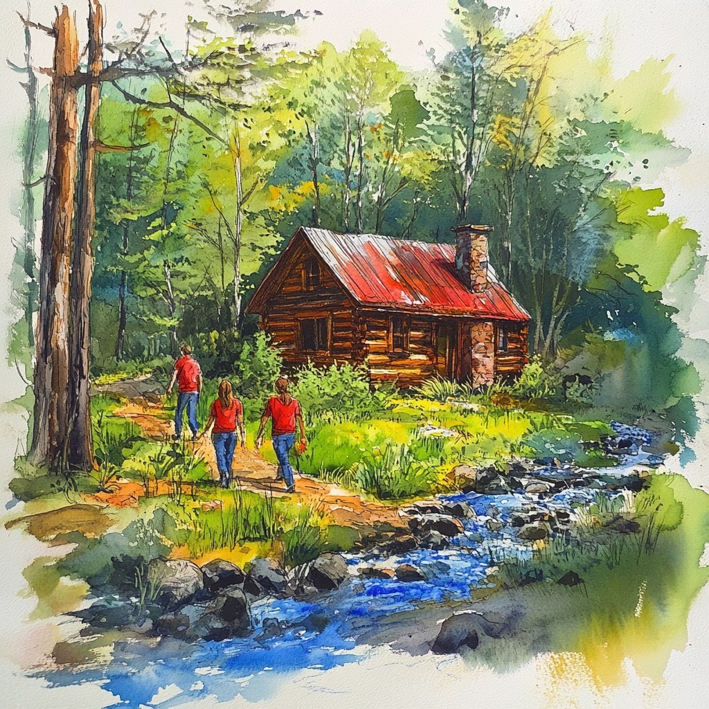 Создано на основе запроса: A cute little cabin in water paint. People walking by a stream. Use vivid colors impressively done.