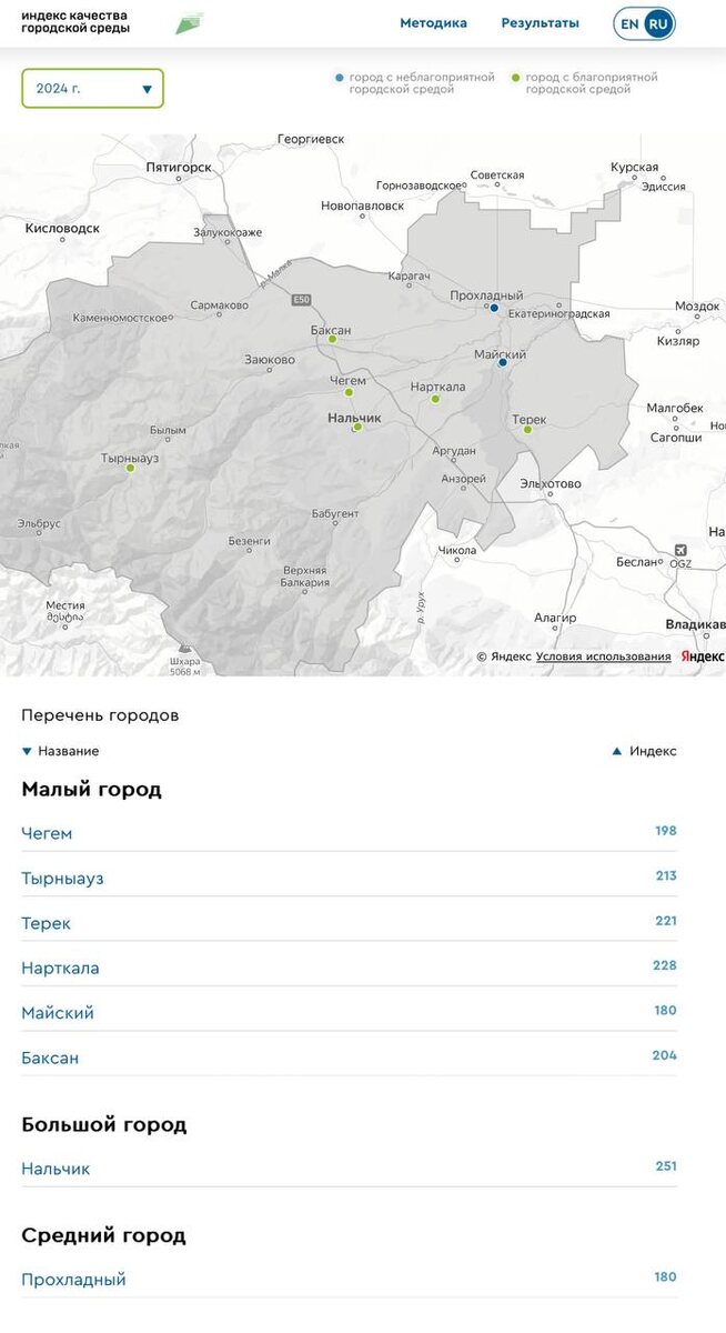 Прохладный и Майский единственные в Кабардино-Балкарии названы «городами с неблагоприятной городской средой» в исследовании «Индекс качества городской среды», представленном минстроем России и ДОМ.РФ. У Нальчика 251 балл из возможных 360. Следом идут Нарткала, Терек, Тырныауз, Баксан и Чегем, у которого 198 баллов. У Прохладного и Майского их по 180. «Индекс формируется Министерством строительства и ЖКХ РФ. Результаты… используются в реализации положений указа президента РФ «О национальных целях развития на период до 2030 года», национального проекта «Жилье и городская среда», в том числе для определения размера субсидии из федерального бюджета бюджетам субъектов на поддержку программ формирования современной городской среды», — поясняется на сайте. @gazetayuga
