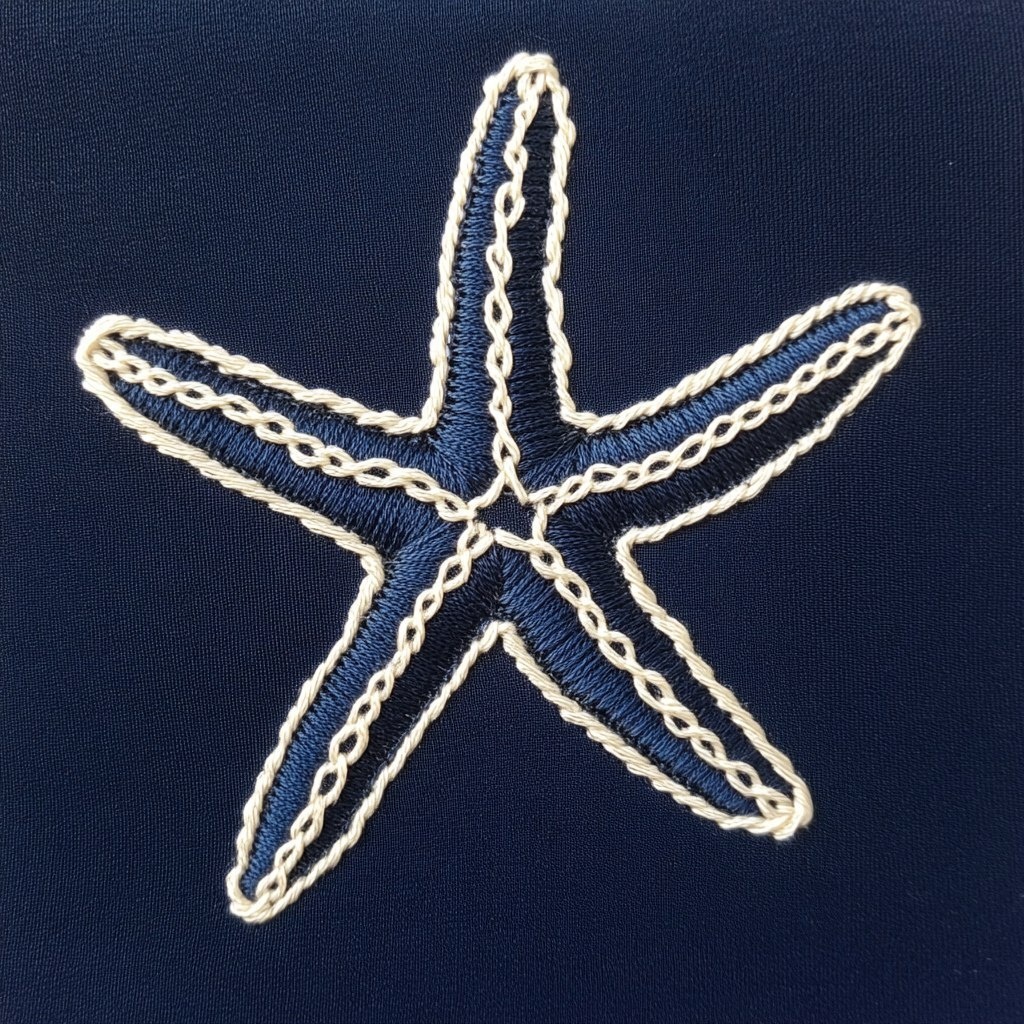 Создано на основе запроса: a chubby and cute outlined starfish artwork, outline stitch with chain stitch details, ivory thread on indigo blue cotton jersey fabric