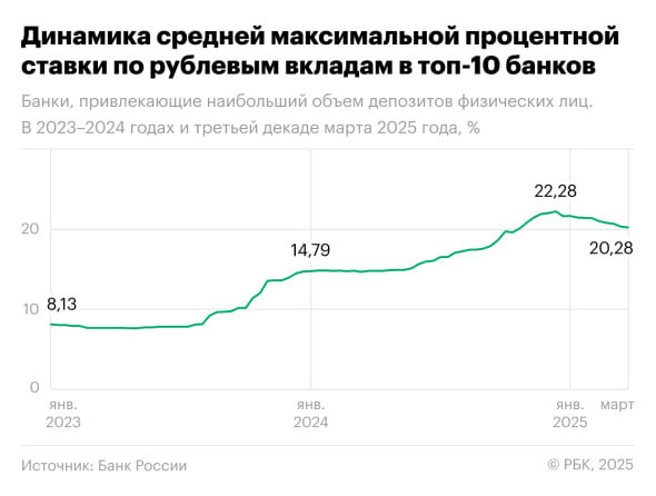 ⚡️ Средняя максимальная ставка по депозитам в топ-10 банков в конце марта снизилась, составив 20,28% — Банк России