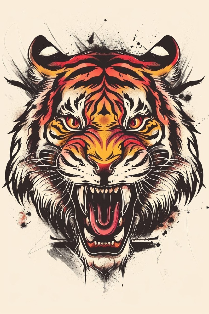 Создано на основе запроса: Fierce tiger head, traditional tattoo style, bold black outlines, red and yellow accents, symmetrical, streetwear