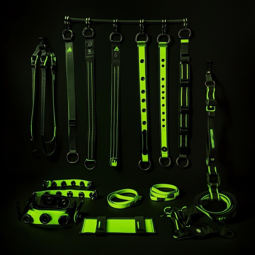 Создано на основе запроса: brand imagery and photography of dog training equipment that evokes goth, grunge, industrial vibes, neon green