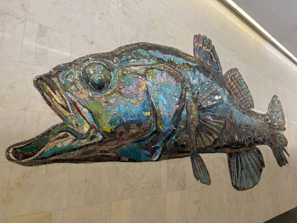 🐟 Потолок входного павильона украшен переливающейся чешуей, а сама станция мозаичными панно из смальты и натурального камня. Выбраны те виды рыб, которые водятся в реках Московского региона.