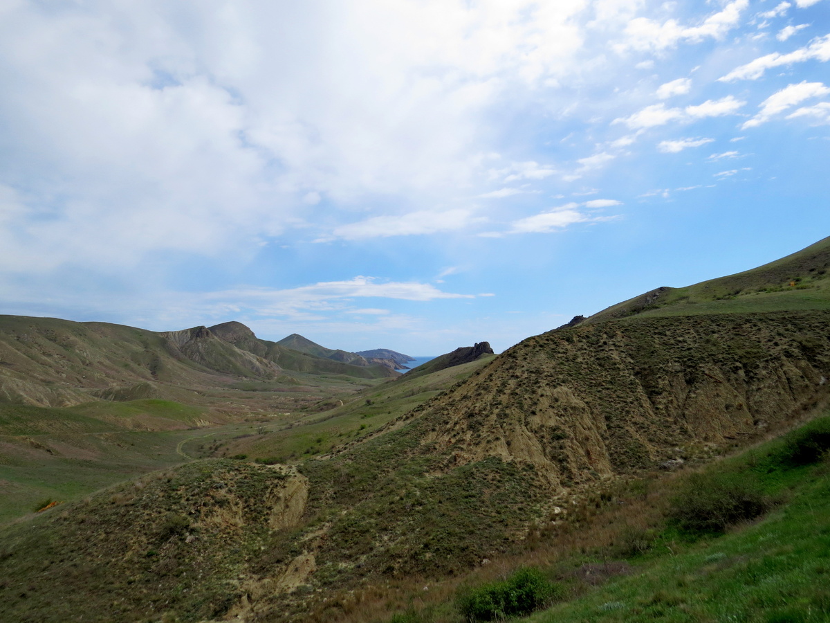 Посидев немного на обочине и не поддавшись соблазну в изменении маршрута, я завернула на склон холма Волошина (Кучук-Янышар). На вершину подниматься желания не было. Пойду по его склону в направлении винзавода. Какие цветы преподнесет мне он? Не винзавод! Хребет. Вот и адонисы. Присела у них. Видна дорога, по которой я только что шла. Дальше мой путь лежит в эту сторону. Пока иду без тропы, просто по направлению. Как же склон похож на склон своего старшего брата Биюк-Янышара! Пион! А почему так мало. Как то этот хребет немного жадный на цветы. Зато виды то какие! Отошла немного в сторону от привычных маршрутов, и уже по-другому смотрится Коклюк. Развернулась гора Клементьеа (Узун-Сырт), обнимая бескрайние виноградники. Ой! Уже и Коктебель показался! Что? Уже все закончилось и конец прогулке? Маловато я цветочков я нашла. Только редкие ирисы попадаются. Зато, какие разноцветные! Даже такой светло-голубой, что почти белый! Посидела у камешка над Коктебелем. Пробежала ящерка, тр