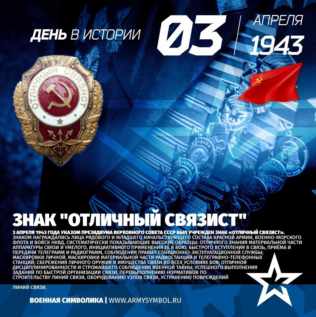 3 апреля 1943 года Указом Президиума Верховного Совета СССР был учрежден знак «Отличный связист». Знаком награждались лица рядового и младшего начальствующего состава Красной Армии, Военно-Морского флота и войск НКВД, систематически показывающие высокие образцы: отличного знания материальной части аппаратуры связи и умелого, инициативного применения её в бою; быстрого вступления в связь, приёма и передачи телеграмм и радиограмм, соблюдения правил станционно-эксплуатационной службы; маскировки личной, маскировки материальной части радиостанций и телеграфно-телефонных станций; сбережения личного оружия и имущества связи во всех условиях боя; отличной дисциплинированности и строжайшего соблюдения военной тайны; успешного выполнения заданий по быстрой организации связи, перевыполнению нормативов по строительству линий связи, оборудованию узлов связи, устранению повреждений линий связи. З Показать полностью... Подпишитесь на наши группы ВКонтакте и в Одноклассниках - читайте, смотрите и