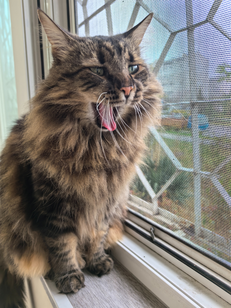 Всем привет! С вами Кузя Кусалочкин и сегодня я расскажу какой сюрприз готовлю хозяевам. Утром получил нет, не паштетик, а креветки. Хозяйка сварила хозяину на обед креветки и мне. Поделили поровну — каждому по 7 штучек. И да, хозяин — большой, а Кузя —маленький, но делить надо пополам. Да ничего особенного. Спал на своём диванчике. А когда просыпался, то шёл на балкон проверять всё ли в порядке. Сидел, никого не трогал, зевнул. И тут хозяйка подловила меня со своим телефоном: Хозяйка, ну что ты меня так некрасиво фоткаешь? Продолжил наблюдение: Погода у нас плохая. К пасмурности, холоду ещё и дождь добавился. А я не люблю дождь: он брызгает и мне становится неприятно сидеть на окошке. Как всегда, сериал смотрели. Там всё сложно, но наконец-то он узнал всю правду. Ну и как всегда: обиды, злость и всё такое. Пока смотрели сериал, хозяин меня гладил. А хозяйка, как всегда, фоткала. Это у меня был сеанс связи с космосом: Получил всю самую важную и нужную информацию. Конечно же, поме