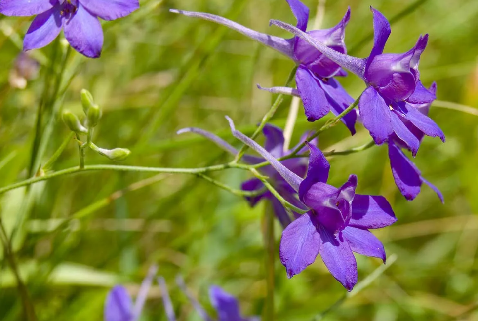 Живокость полевая (Delphinium consolida), также известная как дикий дельфиниум или сокирки, – это однолетнее травянистое растение, которое часто встречается на полях, лугах и обочинах дорог по всей Германии. Его нежные синие, фиолетовые или розовые цветы, собранные в рыхлые кисти, украшают пейзажи с июня по август, привлекая пчёл и бабочек. Это растение относится к семейству лютиковых и достигает высоты 30–70 см. Его листья сильно рассечены на узкие доли, что придаёт им ажурный вид. Цветки живокости имеют характерную шпорцу – длинный вырост, напоминающий шпору, что делает их легко узнаваемыми. В прошлом растение часто использовалось в народной медицине, однако сейчас известно, что оно содержит алкалоиды, которые могут быть ядовитыми для человека и животных. Живокость полевая предпочитает солнечные места с лёгкими, хорошо дренированными почвами. Она часто растёт среди злаков на полях, из-за чего в сельском хозяйстве считается сорняком. Однако в природных экосистемах она играет важную ро
