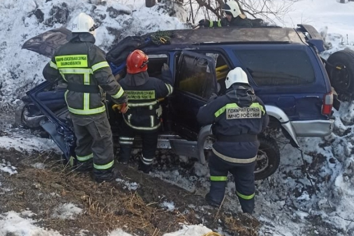 На Сахалине пожарные предотвратили возгорание опрокинутого в кювет автомобиля