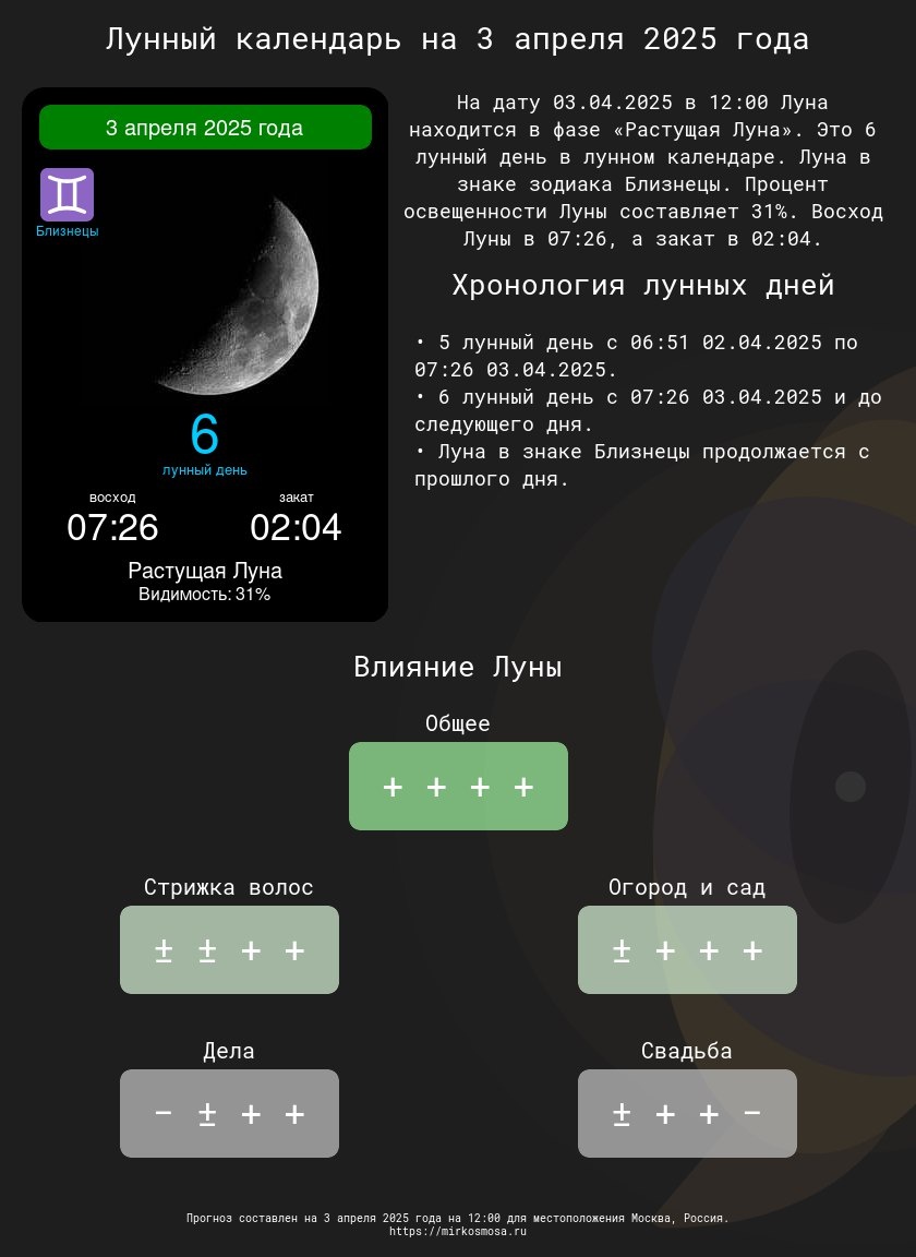 Лунные календари на 3 апреля 2025 года: Подготовьтесь к этому дню с учетом влияния Луны! 🔹🌗 Лунный календарь на 3 апреля 2025 года — Что приготовила Луна? Подробнее 🔹✂️ Лунный календарь стрижек на 3 апреля 2025 года — Подходящий ли день для обновления прически? Подробнее 🔹🌱 Лунный календарь огородника и садовода на 3 апреля 2025 года — Лучшее время для ухода за растениями. Подробнее 🔹📅 Лунный календарь дел на 3 апреля 2025 года — Удачные моменты для важных задач. Подробнее 🔹💍 Лунный календарь свадеб на 3 апреля 2025 года — Подходит ли этот день для вашего торжества? Подробнее