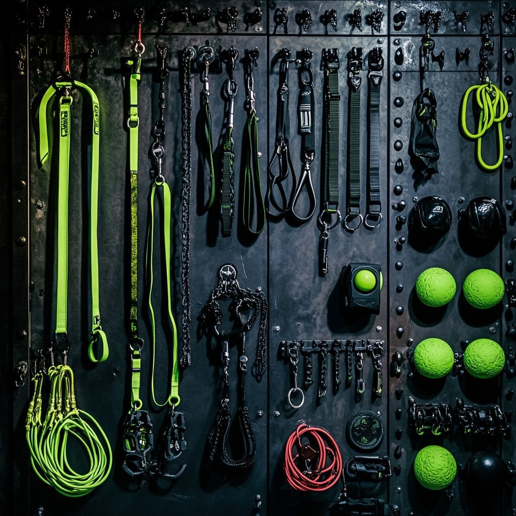 Создано на основе запроса: brand imagery and photography of a dog training equipment wall where leashes and collars are hanging, balls, toys