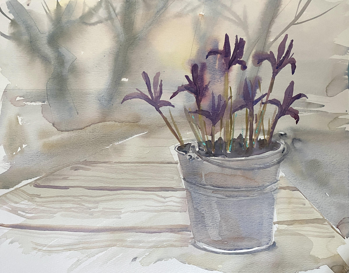 Сегодня я к вам с ведром, но не пугайтесь, оно не пустое. Удача останется на месте. Прошлой осенью, насмотревшись всяких пинтерестов, разложила в большие ведра луковичные и закопала в дальнем углу двора. И вот на днях решила выкопать, а они там, узники моей занятости, уже прорастать начали под землей: в каждом ведре бледно-зелененькие росточки высунули клювики. Скорее-скорее - их на солнце. И сетчатые ирисы на следующий же день расцвели. Вечером, в серо-розовых весенних сумерках уже, так удачно встало это импровизированное кашпо на деревянной дорожке, что пришлось, отложив все дела, браться за акварель. #открытки с пленэра #акварель #акварельный этюд