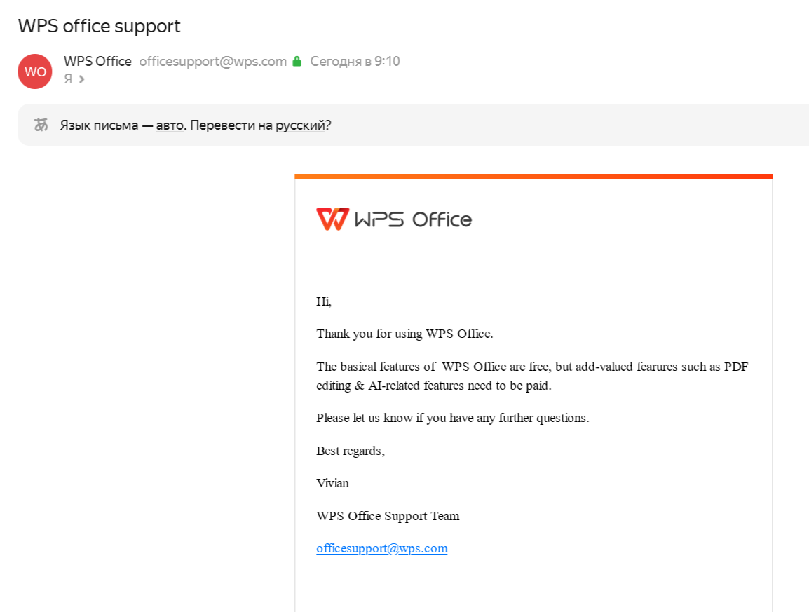 Задал я вопрос в техническую поддержку WPS Office через форму обратной связи в самом приложении: «Можно ли использовать WPS Office в образовательных организациях бесплатно?»