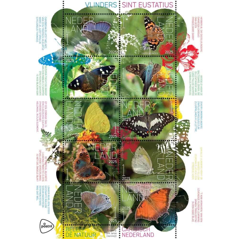 31 марта 2025 года PostNL выпустит Experience Nature - Butterflies St. Eistatius, лист с 10 марками в 10 различных дизайнах. Марочный лист о бабочках Святого Эстатиуса входит в многолетнюю серию Experience nature, посвященную Карибским Нидерландам в 2024-2026 годах. Серия выпускает 4 листа марок каждый год, каждый из которых содержит 10 различных марок. Размер марки 40 x 30 мм. Размер листа 122 x 170 мм. Самоклейки. Тираж 275 000 листов. Остров Святого Эстатиуса, как и Бонайре и Саба, имеет отдельный статус в составе Нидерландов. Собирательное название 3 островов — Карибские Нидерланды. Вместе со странами Аруба, Кюрасао и Синт-Мартен они образуют карибскую часть Королевства. Остров Сент-Эстатиус, который сами островитяне называют Стейша, относится к Наветренным островам. Это обозначение относится к положению островов по отношению к преобладающим северо-восточным пассатам. Сент-Эстатиус расположен между Сабой и Сент-Китсом и Невисом и отделен от этих островов мелководным морем. Единстве