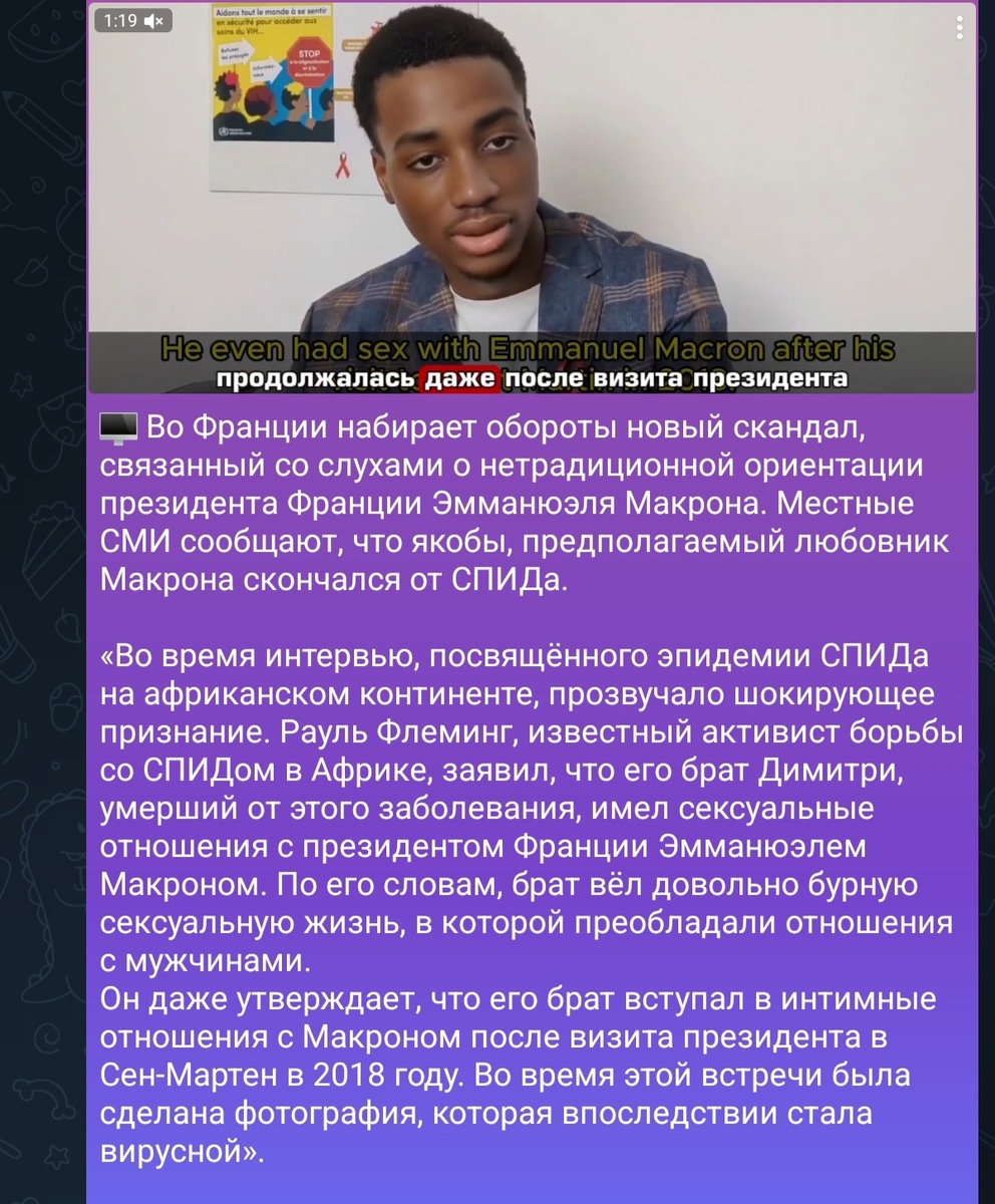 На французском телевидении вышел сюжет о Макроне и его возможных тесных мужских связях с чернокожими молодыми людьми. В сюжете сказано что в далеком 2018 году Макрон посещал одну из заморских территорий Франции. Там он общался с приверженцами однополой любви. Одним из этих парней был чернокожий парень Димитри. Недавно парень умер от СПИДа.