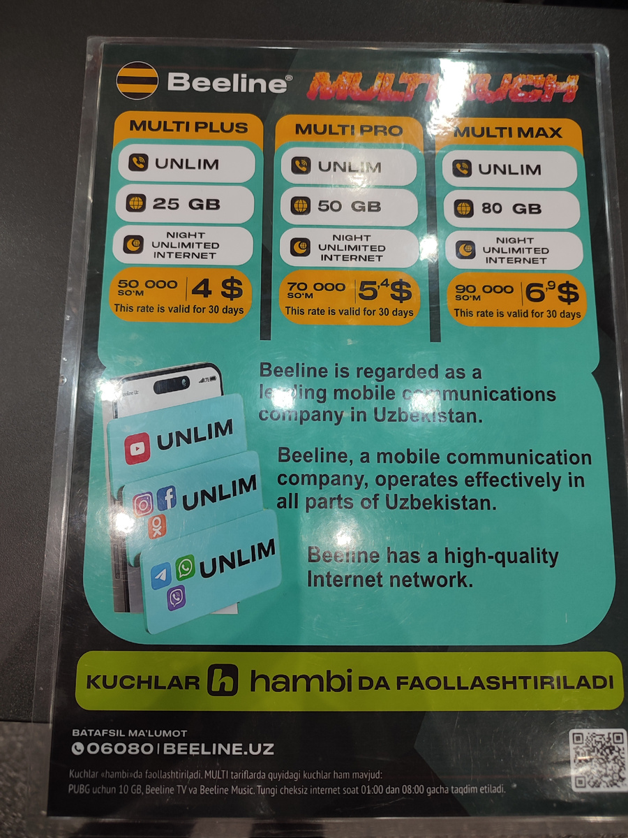 В Ташкенте мой МТС ловит, но цены в роуминге космос - 400 руб день. Поэтому я решил купить местную СИМ карту. У них тут 6 операторов связи, в том числе Билайн, который я и выбрал. Тариф специальный туристический на 30 дней, далее симка сама деактивируются. Цена 70000 сум = 458 руб. В него входит безлимитные звонки, 50Гб интернета (+ночью безлимит) и безлимитные соц.сети ватсап, телеграм, ютуб, инстаграм и почему-то одноклассники 😄. Итог: связь ловит хорошо, интернет летает, я доволен. И ещё особенно приятно, что инста и ютуб работают без всяких ВПН.