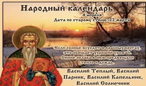 4 апреля. Василий. Василий Теплый. Теплый. Парник. Солнечник. Капельник. В этот день Православная Церковь почитает священномученика Василия, пресвитера Анкирского ❇️ПРИМЕТЫ ✔️Если тепло и ясно — весна будет ранней и дружной. ✔️Много капели с крыш — к урожайному лету. ✔️Птицы вьют гнёзда — к устойчивому теплу. ✔️Если в этот день прилетели скворцы — весна окончательно вступила в силу. ✔️Облачное небо и ветер — возможны возвратные заморозки. ❌ЧТО НЕЛЬЗЯ ДЕЛАТЬ ✔️Жаловаться на судьбу или ругаться — можно «спугнуть весну». ✔️Ссориться с близкими — это грозит разладами на весь сезон. ✔️Работать в поле — день подходил для подготовки, но не для посева. ✔️Игнорировать помощь нуждающимся — считалось плохой приметой. ✔️Переедать и злоупотреблять алкоголем — день требовал умеренности. ✅ЧТО МОЖНО ДЕЛАТЬ ✔️Устраивать генеральную уборку в доме и во дворе. ✔️Выходить на свежий воздух, особенно с детьми. ✔️Начинать работы в саду или на огороде. ✔️Кормить птиц, особенно прилетевших с юга. ✔️Чи