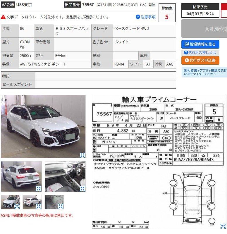 Сегодня на торгах!📈 Audi RS3 2024 года 👍🏼 🚘2.5 литра, 4WD, пробег 4.882 км, аукционная оценка 5 баллов! А теперь по традиции угадываем, сколько же выйдет эта крошка 😏 Кто будет ближе всего к цене продажи, получит на карту 500₽‼️ Старт аукциона - 6.230.000 йен Начинаем! МИНИ-РОЗЫГРЫШ ЗАВЕРШЕН! Итог торгов - 7.230.000 йен
