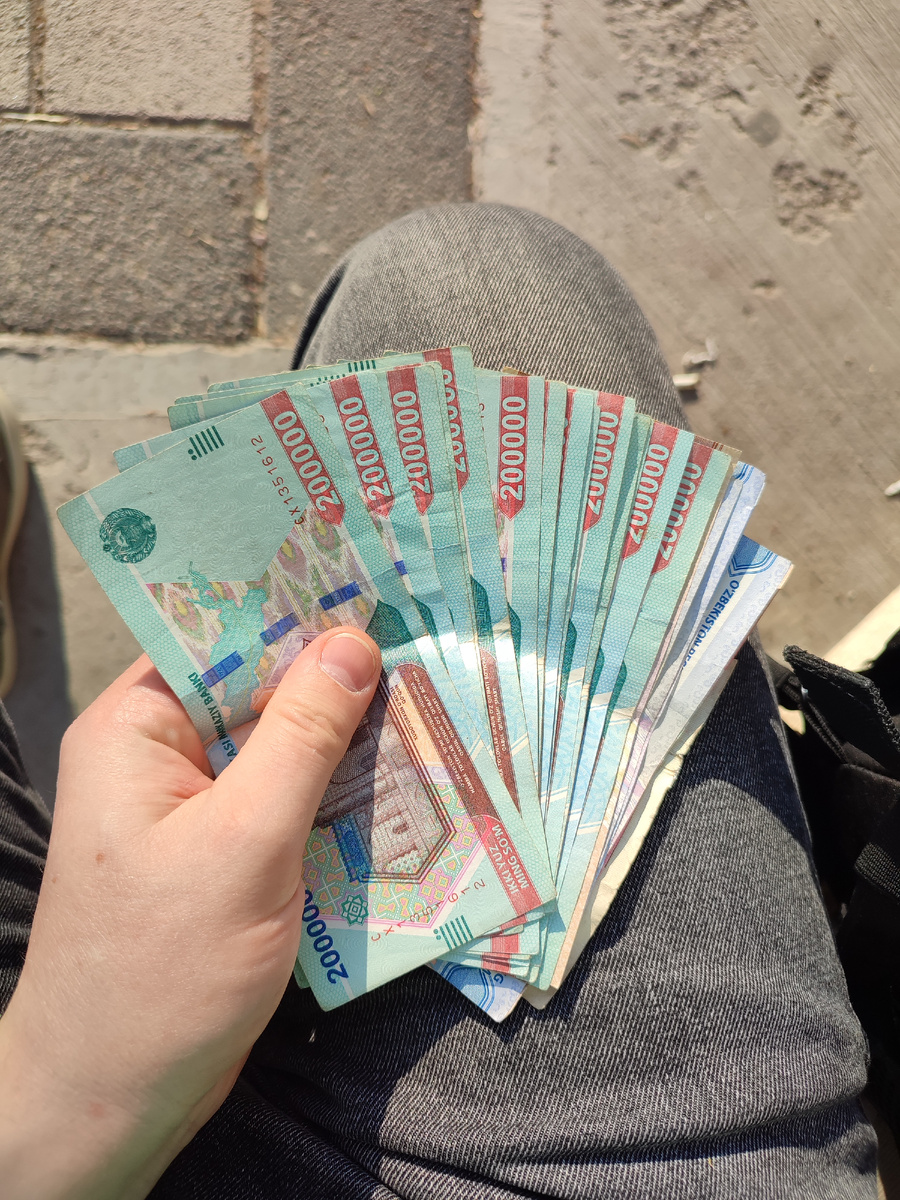 В Ташкенте я обменял доллары на Сумы. По курсу 1$=12935сум. И у меня из трехсот долларов получилось 3.870.000 сум. Почти миллионер😂 Если переводить на рубли для понимания, то 100руб=15240сум. К примеру почти везде плюс минус, порция плова/лагмана/шурпы стоит 30000-50000сум, что на наши рубли около 200-300руб.