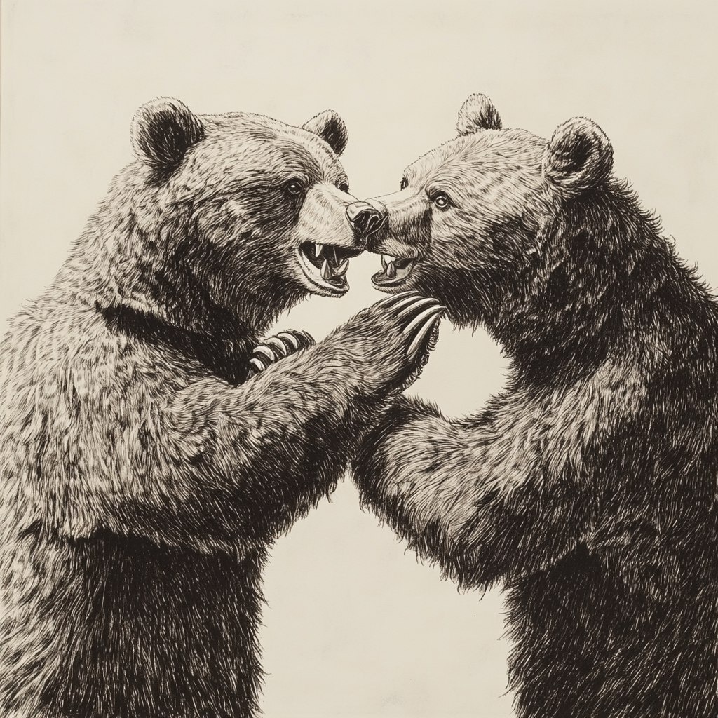 Создано на основе запроса: two bears slapping eachother on face, monochromatic drawing