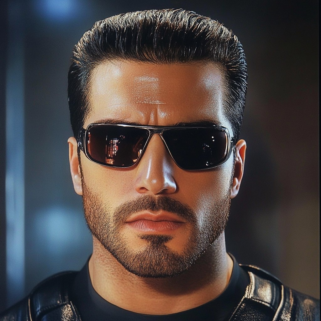 Создано на основе запроса: Make this picture as Terminator 2 like Arnnold with the sunglasses