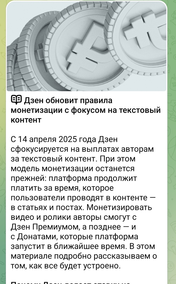 Дзен меняет правила игры для авторов: платформа отключает монетизацию видео с 14 апреля 2025г. Все это означает, что авторы смогут зарабатывать только на статьях и постах. Но посты видят только подписчики, поэтому главным форматом Дзен становятся статьи. Когда я начинала писать, то статьи были моим единственным форматом и мне самой больше нравится читать, а не смотреть. Но Дзен вынудил снимать видео, начал давать видеоформату больше показов. Пришлось подстраиваться, даже некоторые фитюльки освоила. В моей тематике спецэффекты не нужны, поэтому видео стали более легким и быстрым "продуктом". Правда, смотреть видео не очень интересно из-за бесячей навязчивой рекламы, которая включается в самый неожиданный момент и почему-то на очень высокой громкости. Аж подскакиваешь от таких сюрпризов. Но и плюсы у видео есть, отказываться от них точно не буду. Некоторые вещи намного удобнее показать вживую, со звуками и комментариями. Возможно, буду делать дублирующий формат для разной аудитории. Т