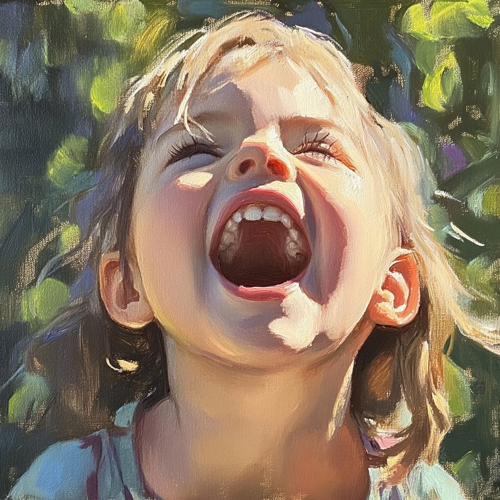 Создано на основе запроса: An oil painting of a cute little girl's face in the sunlight, playfully opening her mouth to show her missing two teeth.
