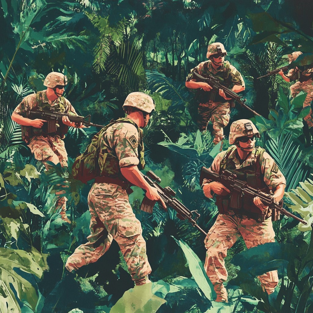 Создано на основе запроса: make a textile pattern of different American marines scattered unidirectionally in jungle background