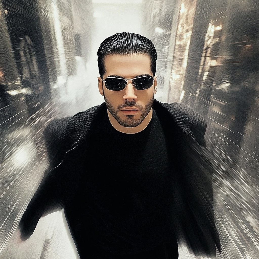 Создано на основе запроса: Make this picture as Neo in the matrix with the sunglasses, shotting in the building scene of the 1rst movie when he is runing in the wall