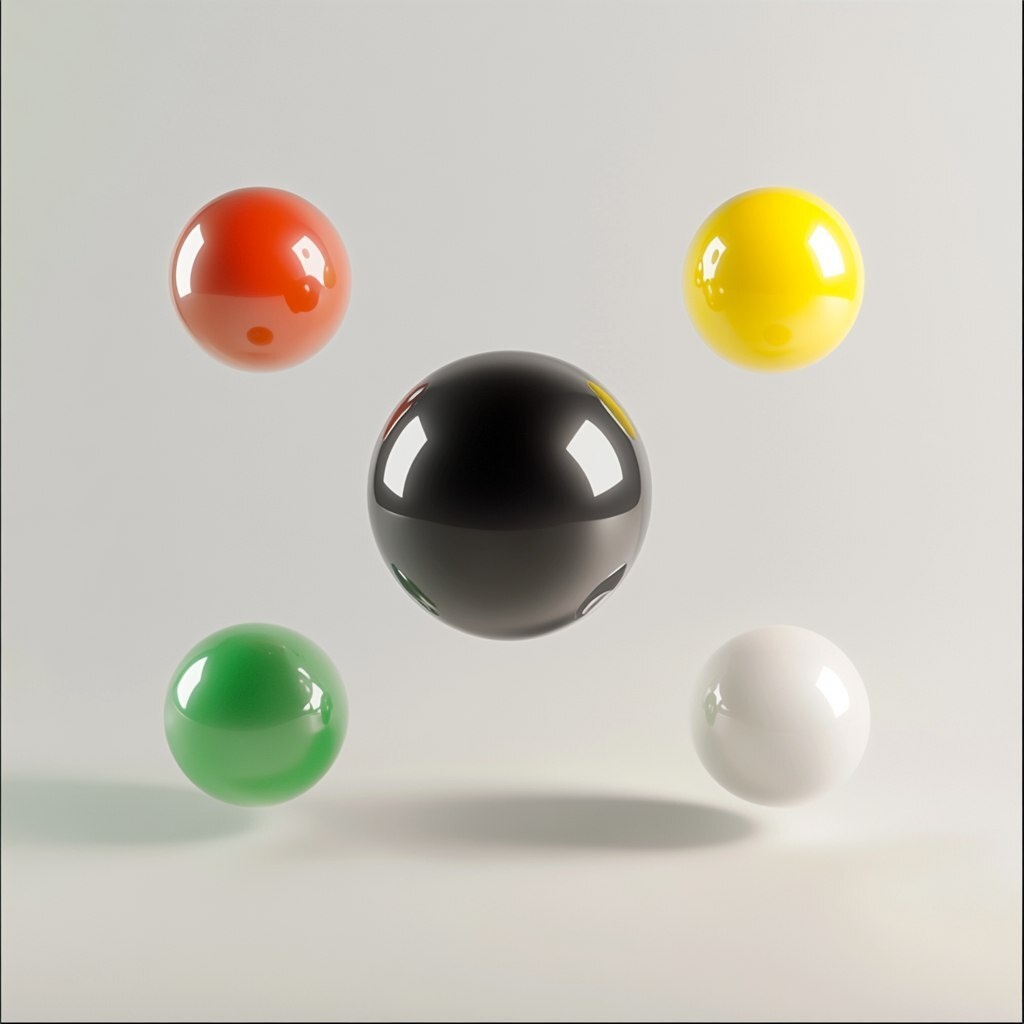 Создано на основе запроса: A set of five floating luminous same sized colored, round translucent spheres, with one black ball in the middle and four colored spheres arranged around it at the foor corner positions. all against a pure background. The colored spheres include green lower left position, yellow upper right position , red upper left position , white lower right position. Each sphere is designed with smooth edges and rounded shapes, creating an overall flat appearance. This composition highlights their uniformity without any text or design elements.
