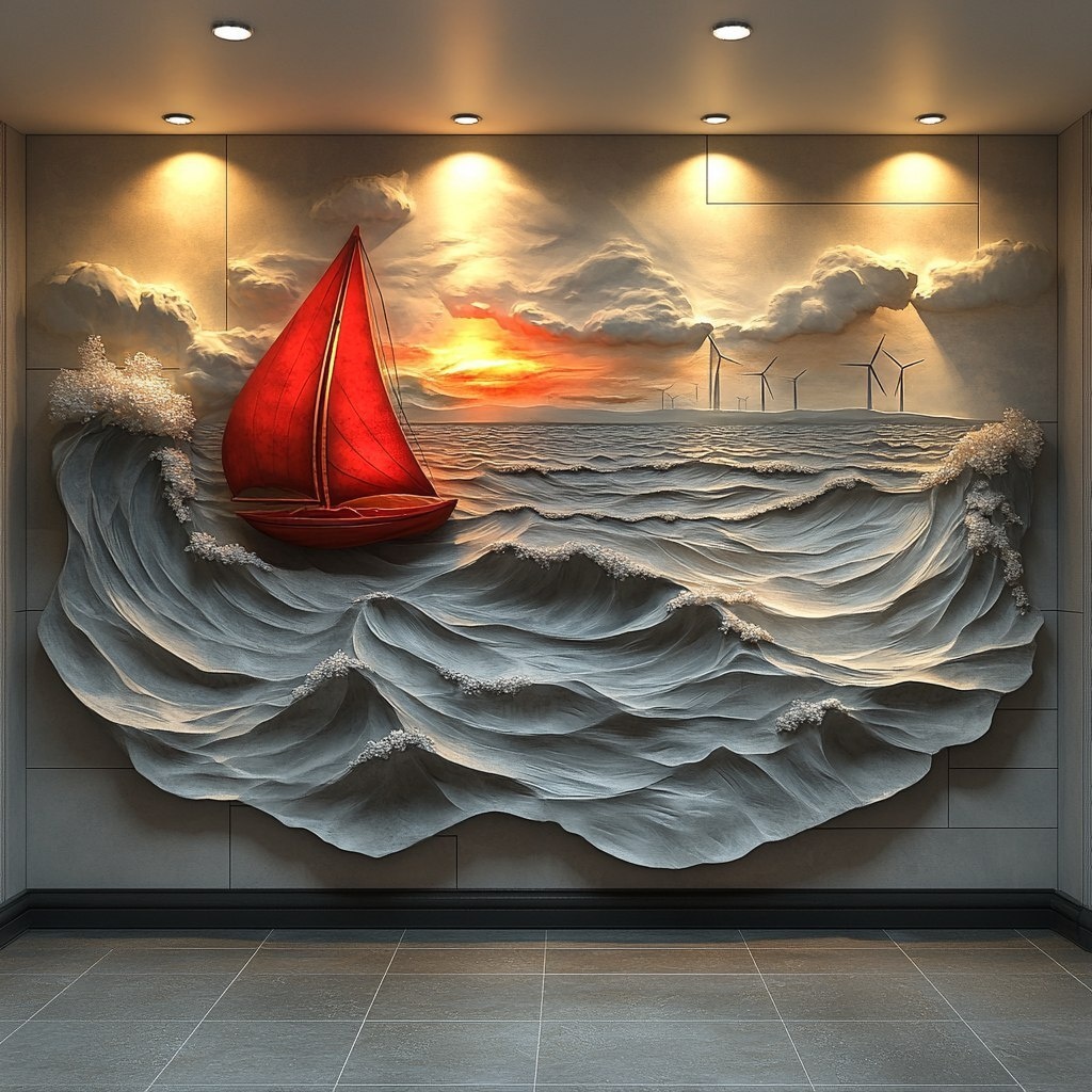 Создано на основе запроса: Change white to light blue, and make the sailboat bigger,On a wall that is three meters high and five meters wide, create a relief depicting the coastline and offshore wind farm, with an LED red sailboat embedded in the middle. --- Автоперевод: Измените белый на светло -голубой, и сделайте парусник больше , на стене, высотой три метра и пять метров, создайте облегчение, изображающую береговую линию и морскую ветряную ферму, со светодиодной красной парусной лодкой, встроенной в середину. Как тебе эта картинка? 🤔 https://dzen.ru/id/65c0c65c86e4f837c27b24d7 #ИИ #AI #нейросеть #midjourney #art