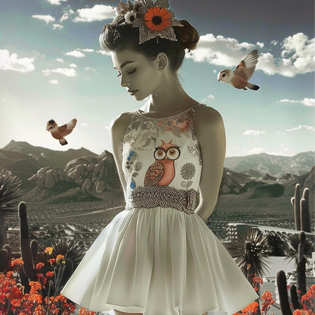 Создано на основе запроса: Trompe-l'œil pastel artwork my monster in a fiber optic floral owls dress by Emilio Pucci, degas, federico
