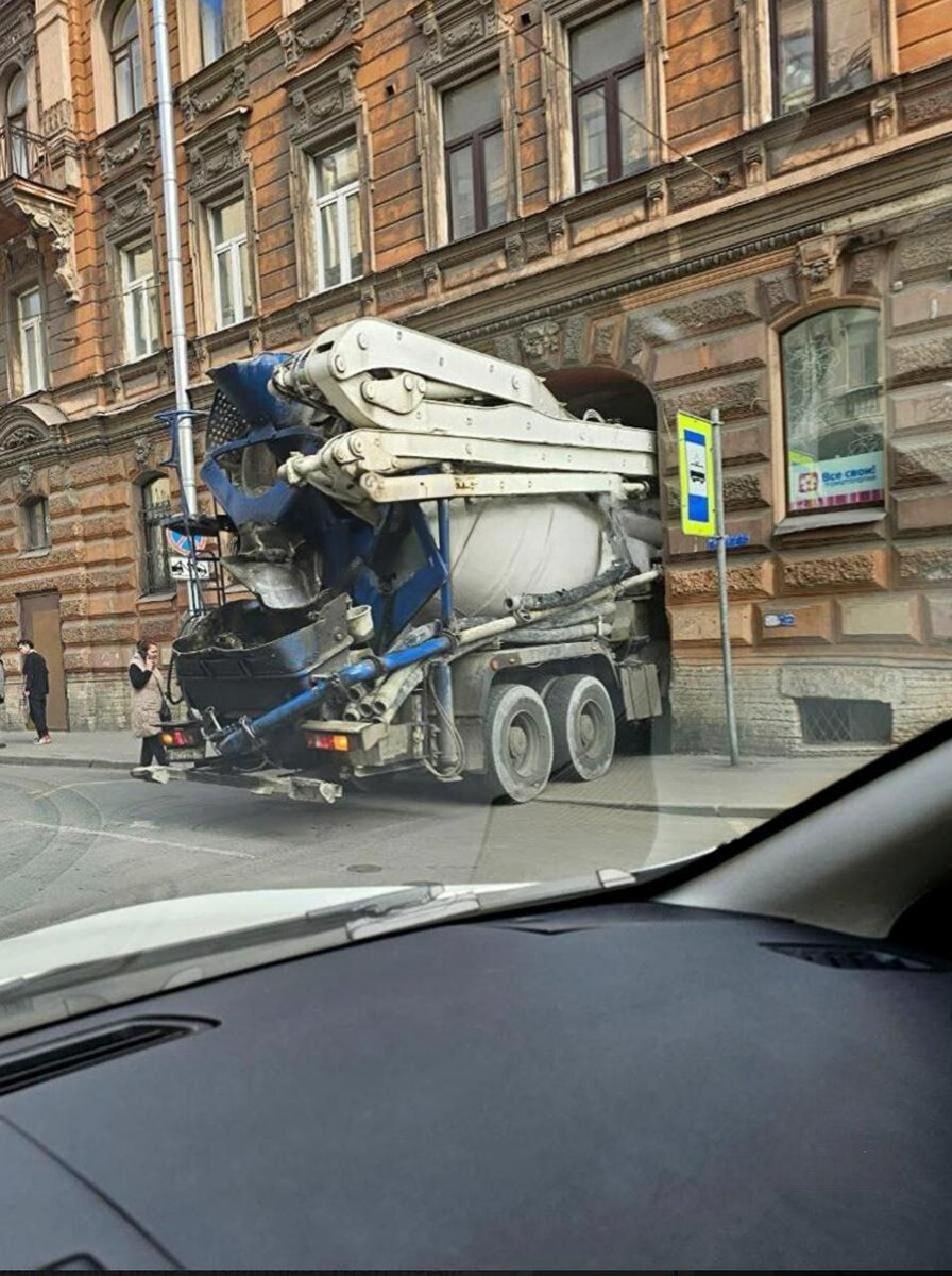 Питер. Водитель бетономешалки решил, что габариты — это для слабаков, и полез в арку. Застрял намертво. Теперь у города новая инсталляция: бетон, арка и жажда авантюр.