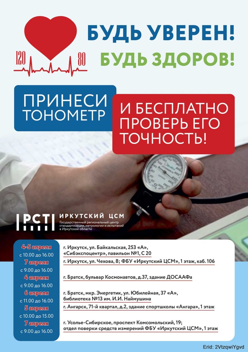 Акция приурочена к Всемирному дню здоровья, который отмечается 7 апреля, и пройдет во всех регионах страны. В Иркутской области - в Ангарске, Братске, Иркутске и Усолье-Сибирском. С 4 по 7 апреля специалисты Иркутского ЦСМ бесплатно проверят точность домашних тонометров жителей этих городов. Ведь здоровье — самое важное. Приглашаем всех желающих!!!Ведь здоровье — самое важное. Участвуйте в акции и убедитесь, что ваши тонометры исправны и работают на благо вашего здоровья!