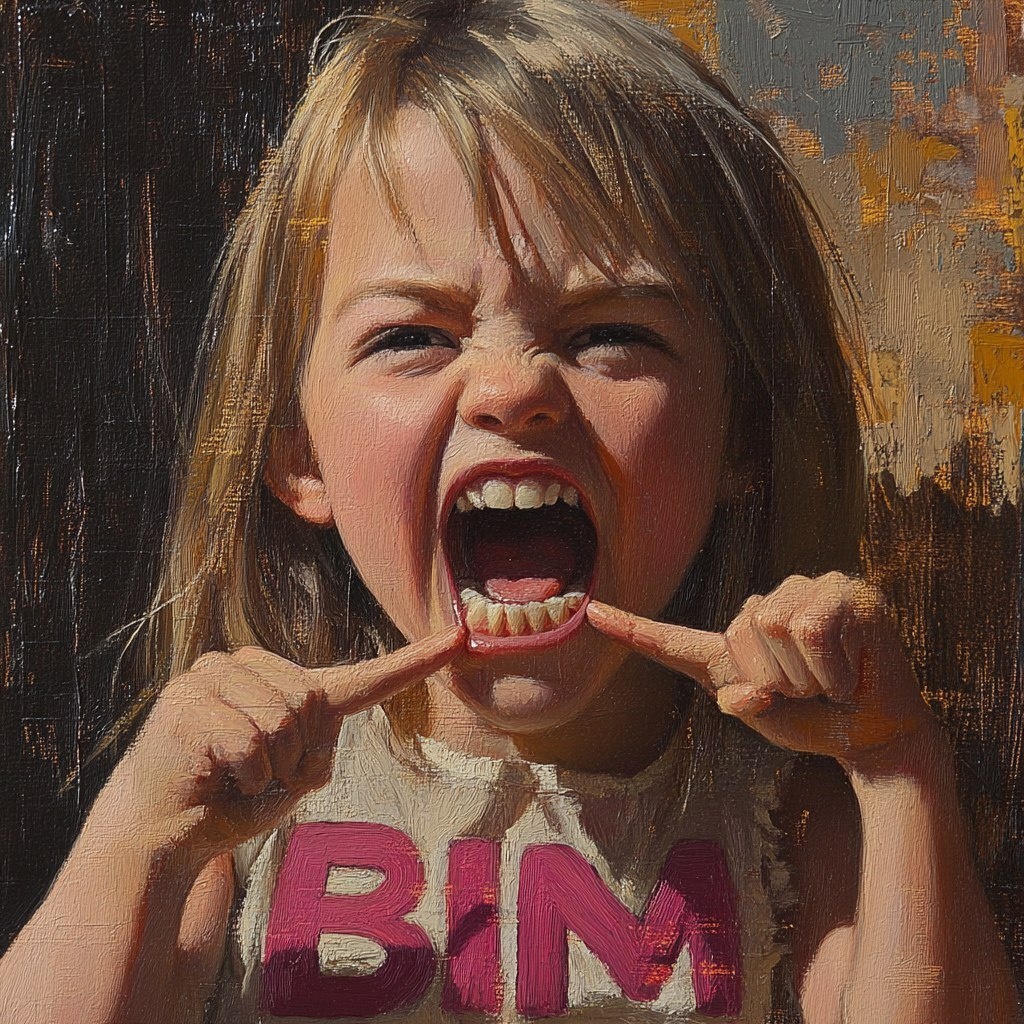 Создано на основе запроса: An oil painting of a cute little girl from the neighborhood, her face illuminated by sunlight, with a playful expression as she opens her mouth wide and points to the empty spaces where her two teeth have fallen out due to losing them. Letters 'BIM' IN HER MOUTH --- Автоперевод: Масляная живопись милой маленькой девочки из района, ее лицо освещено солнечным светом, с игривым выражением, когда она широко открывает рот и указывает на пустые пространства, где ее два зуба выпадают из -за их потери. Необычно вышло? 🤔 https://dzen.ru/id/65c0c65c86e4f837c27b24d7 #ИИ #AI #нейросеть #midjourney #art