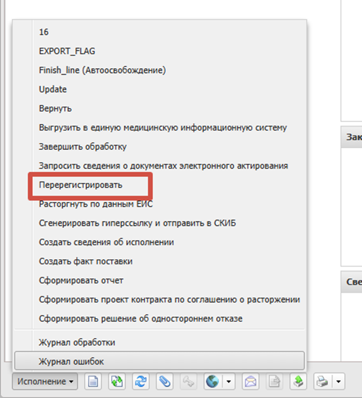 1) В системе АЦК-ГЗ, в контракте, который находится на статусе «Исполнение» выполняем действие «Перерегистрировать»