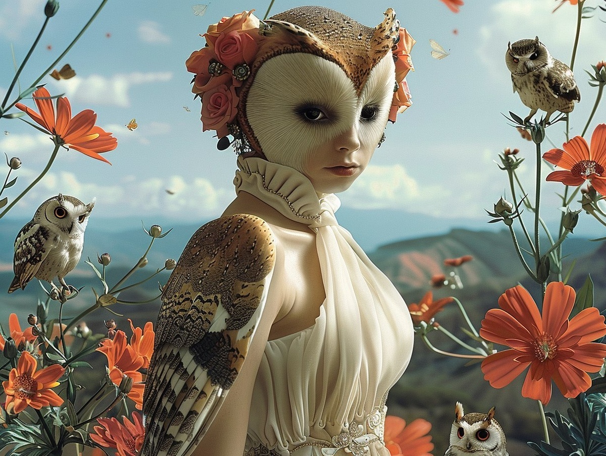 Создано на основе запроса: hyperrealistic Trompe-l'œil pastel artwork my monster in a fiber optic floral owls dress by Emilio Pucci