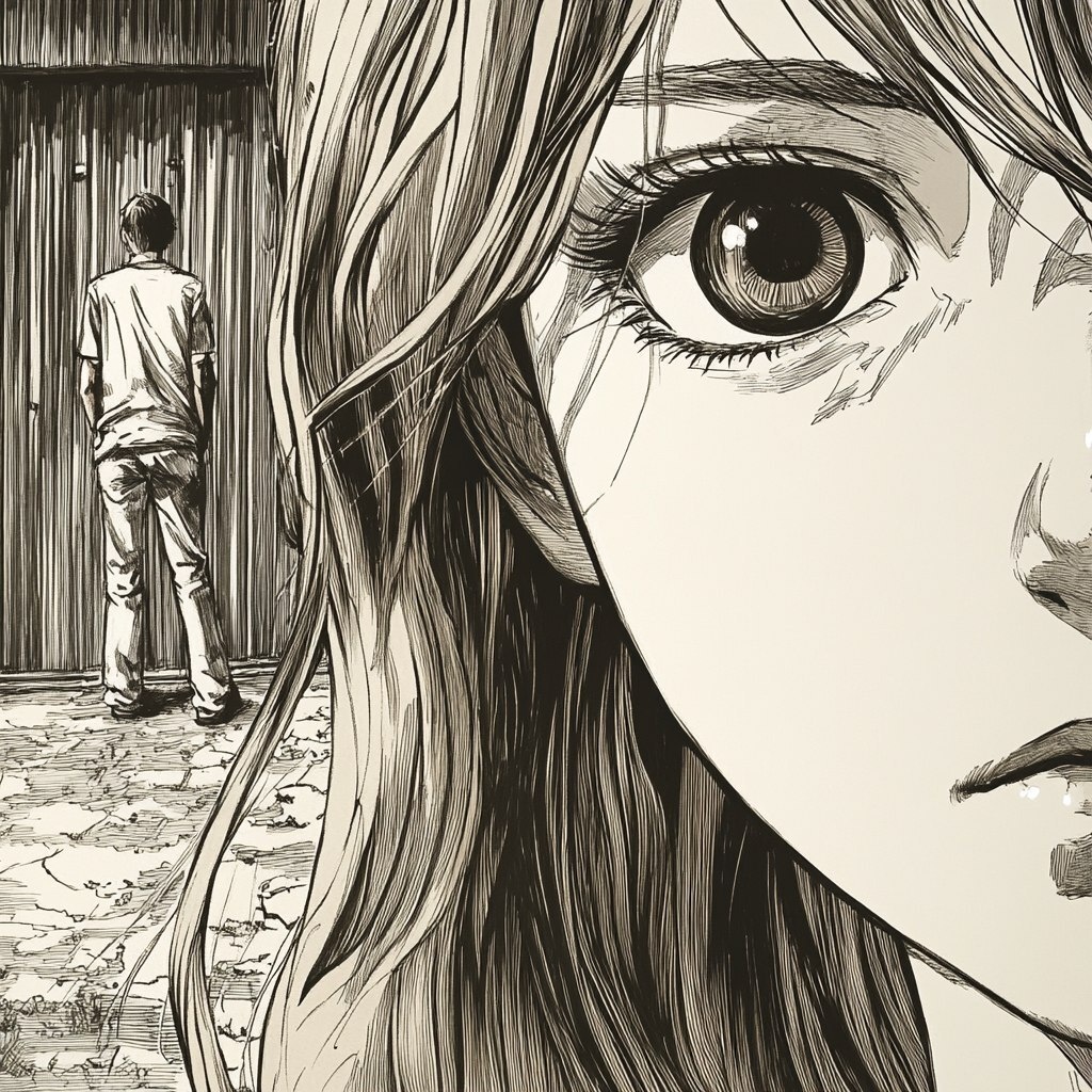 Создано на основе запроса: man standing in background over shoulder of woman’s face, close up of woman’s face manga style ar 1:2