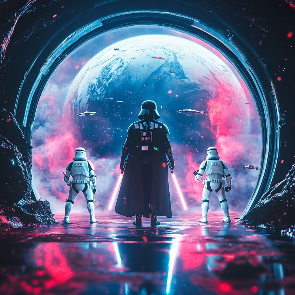Создано на основе запроса: galaxy planet with storm troopers and darth vader standing in the middle with a lightsaber ar 2:3