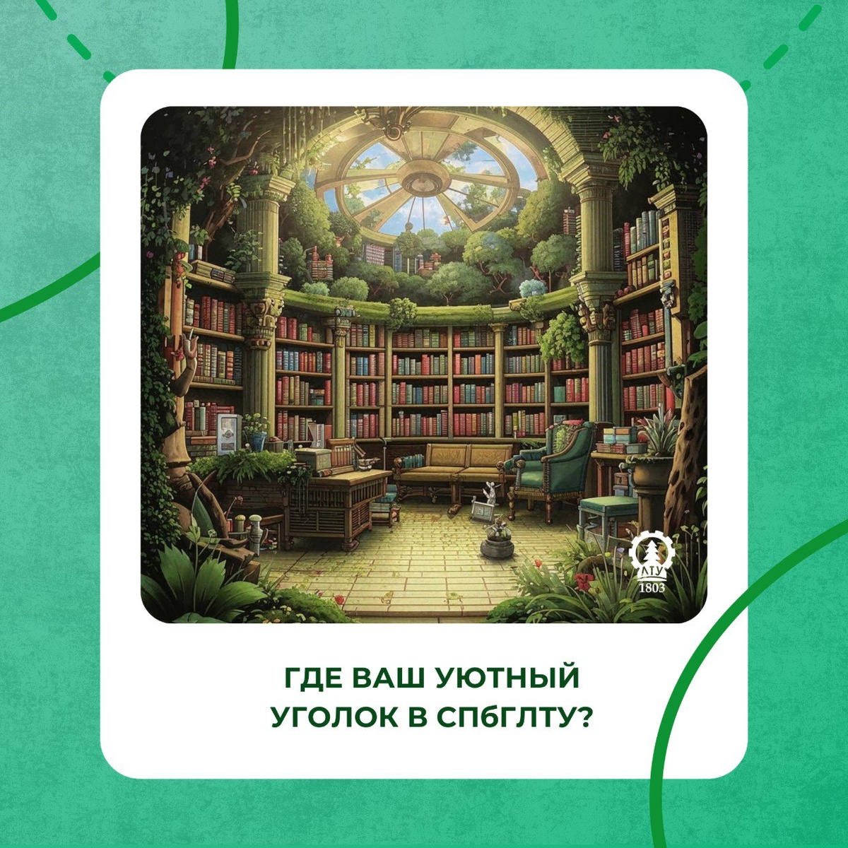 🤩ервый лесной на связи🤩 У каждого из нас есть уголок в стенах СПбГЛТУ, где особенно приятно проводить время. ❓Где ваш❓ Библиотека, ботанический сад, столовая или, может, тайная скамейка в парке? Делитесь в комментариях — соберем топ уютных мест вуза🤩 #КомментарииПриветствуются