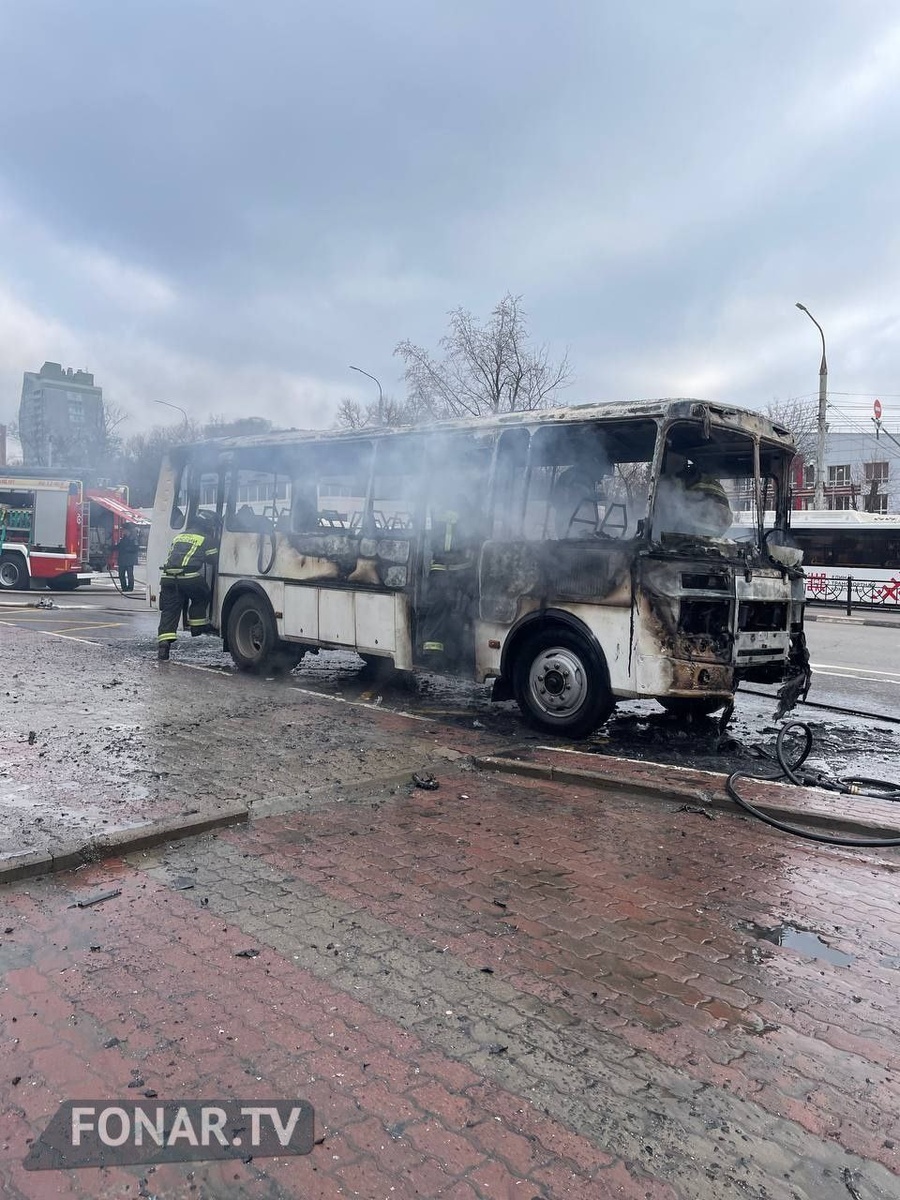 Пожарные уже потушили загоревшийся автобус. Он сильно пострадал