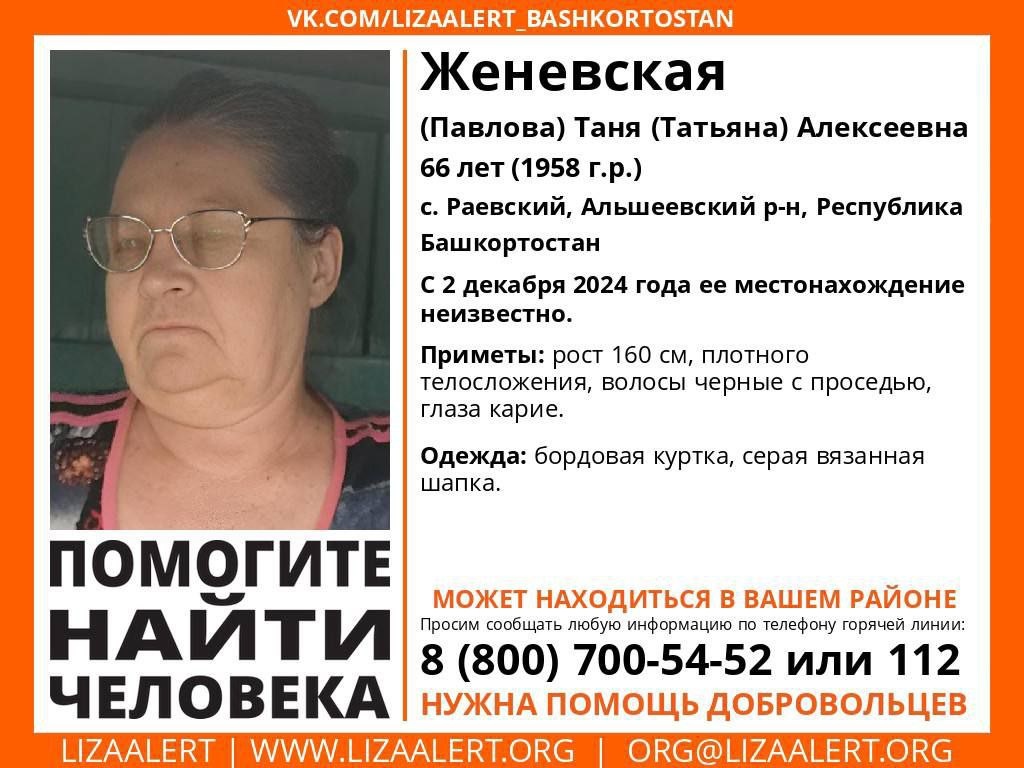 Внимание! Помогите найти человека! Пропала Женевская (Павлова) Таня Алексеевна, 66 лет (1958 г.р.), с. Раевский, Альшеевский р-н, Республика Башкортостан. С 2 декабря 2024 года ее местонахождение неизвестно. Инфорг поиска: Юлия (Лыпса) 89511167009 Может находиться в вашем районе! Максимальный репост!