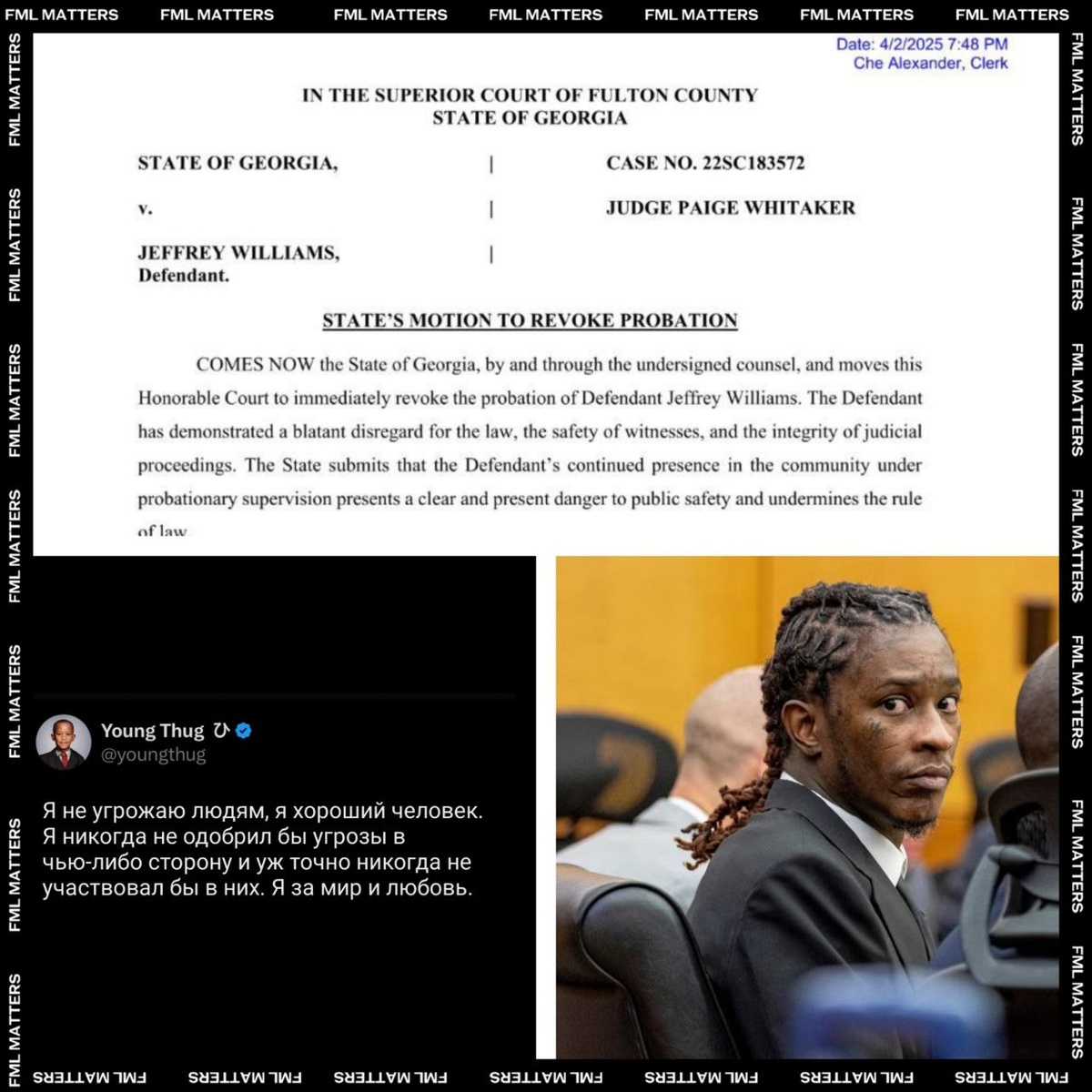 ❗️ YOUNG THUG РИСКУЕТ ВЕРНУТСЯ В ТЮРЬМУ! Прокуратура Джорджии подала в Верховный суд ходатайство об отмене его условного освобождения, ссылаясь на посты Тага в Твиттере (Х), где он обвинил следователя Мариссу Виверито во лжи и, что, по мнению обвинения, спровоцировало волну угроз в её и её семьи адрес, а также разжигало ненависть к полиции Атланты. Публикация Тага набрала более 2 миллионов просмотров и вызвала тысячи угрожающих комментариев и ретвитов. Адвокат Тага утверждает, что его подзащитный не нарушал условий условного освобождения и ходатайство безосновательно: «Угрожать убийством другому человеку никогда не следует. Ходатайство обвинения об отмене испытательного срока Джеффри должно быть быстро отклонено. Безответственно подавать ходатайство такого рода, когда Джеффри не сделал абсолютно ничего, чтобы нарушить какие-либо условия испытательного срока или угрожать свидетелю», — адвокат Брайан Стил 💀 FML MATTERS