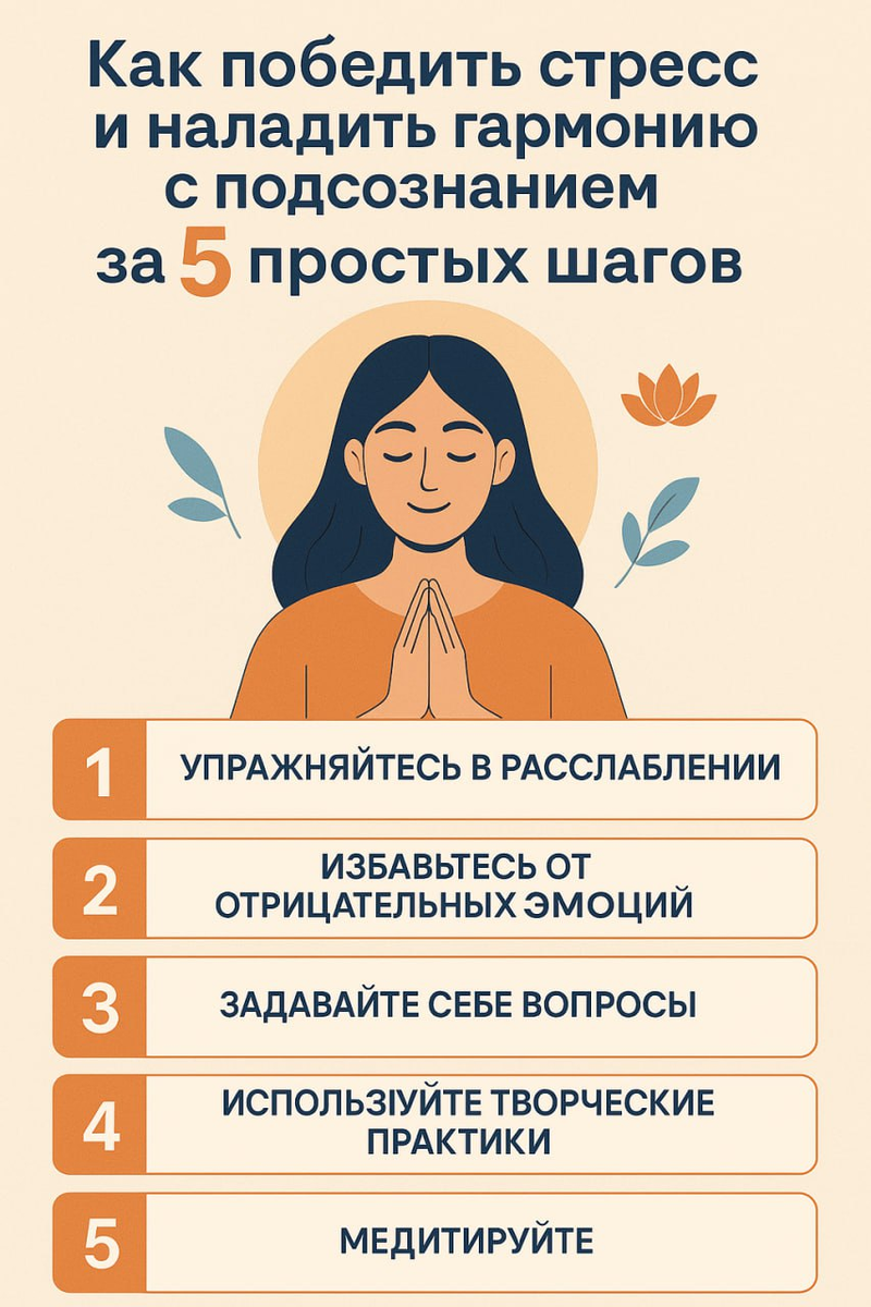 Виток, друзья! Управление стрессом и гармония с нашим подсознанием — это не ракета. Всё, что нужно, — это практиковать техники, которые я упомянул. Чувствуете напряжение? Попробуйте глубокое дыхание или творчество! Наш мозг — это величайший инструмент, который в состоянии сделать невозможное, если мы только научимся прямо с ним работать.