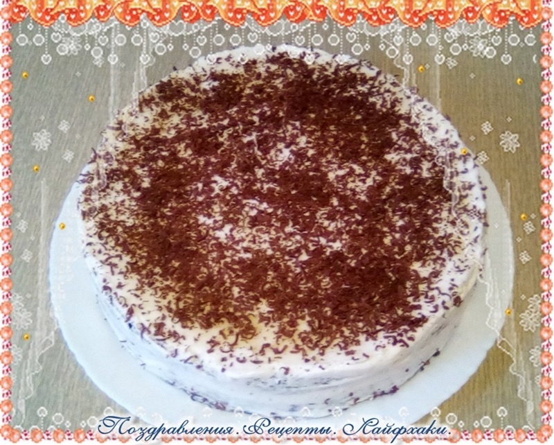 Каждый корж промазать обильно кремом и поставить на ночь в холодильник. Когда торт пропитается сверху украсить тертым шоколадом.