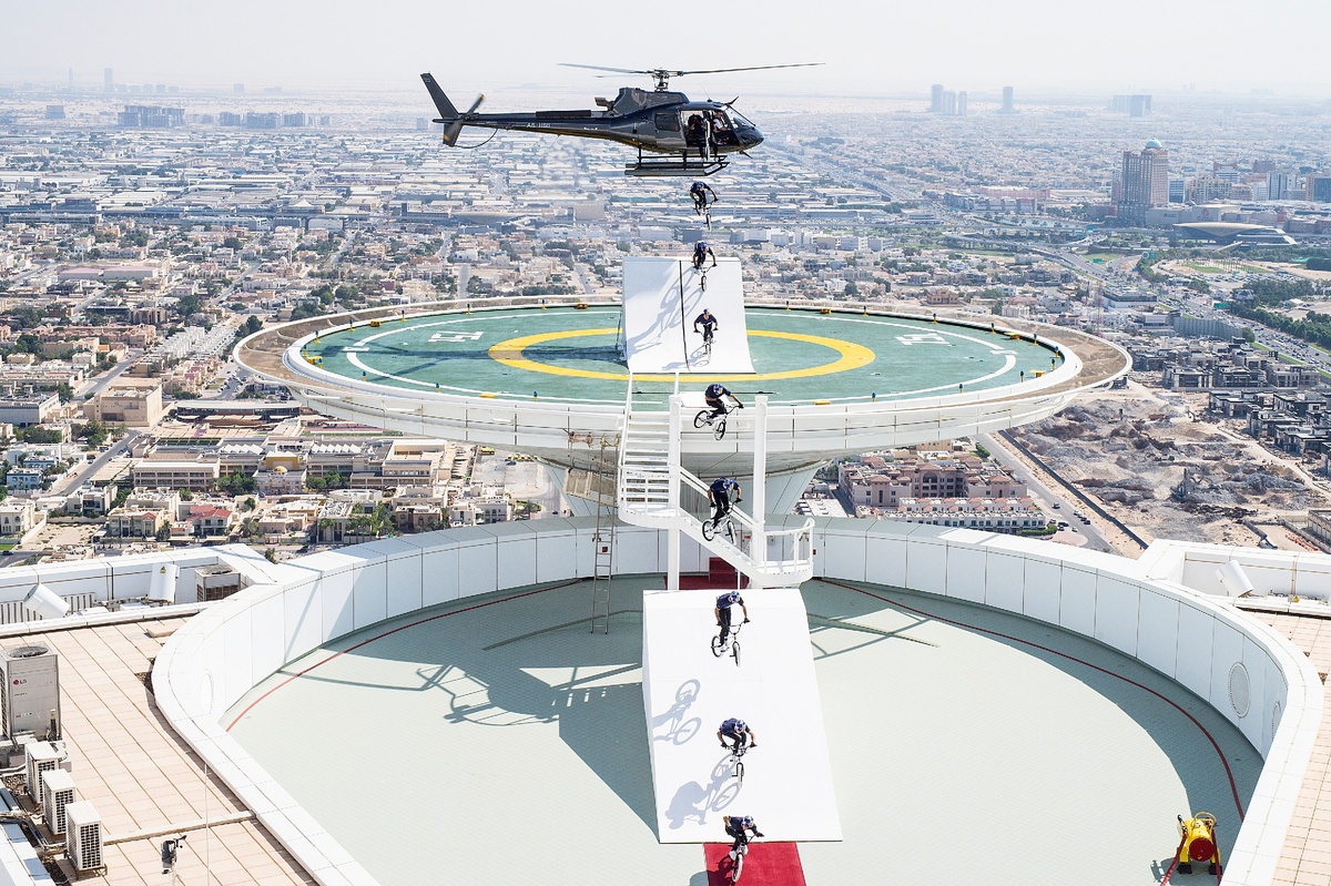 BMX-райдер Крисс Кайл совершил то, на что мало кто осмелится: он выпрыгнул из вертолёта с велосипедом в руках и приземлился на рампу, установленную на вертолётной площадке знаменитого отеля Burj Al Arab — на высоте…