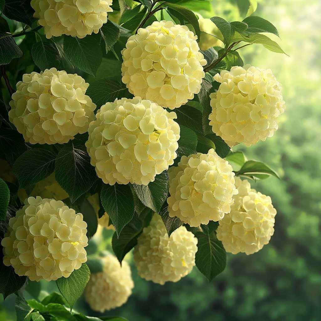 Создано на основе запроса: Ultra-realistic full bush of Viburnum opulus 'Roseum' (Snowball tree) with large lemon-yellow flowers