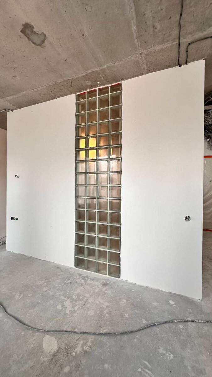 Стеклоблоки в последнее время часто можно увидеть в проектах дизайнеров. На данном объекте спальную зону расположили в центре квартиры, нет окон и такое решение из блоков очень кстате. В среднем квадратный метр таких блоков выходит 11-12 тыс. ₽ не дешево конечно) но смотреться интересно. Блоки заказали у изготовителя - https://glassblock.ru/product/vitrablok/bestsvetnyy/arktika/ На финиши будет 🔥